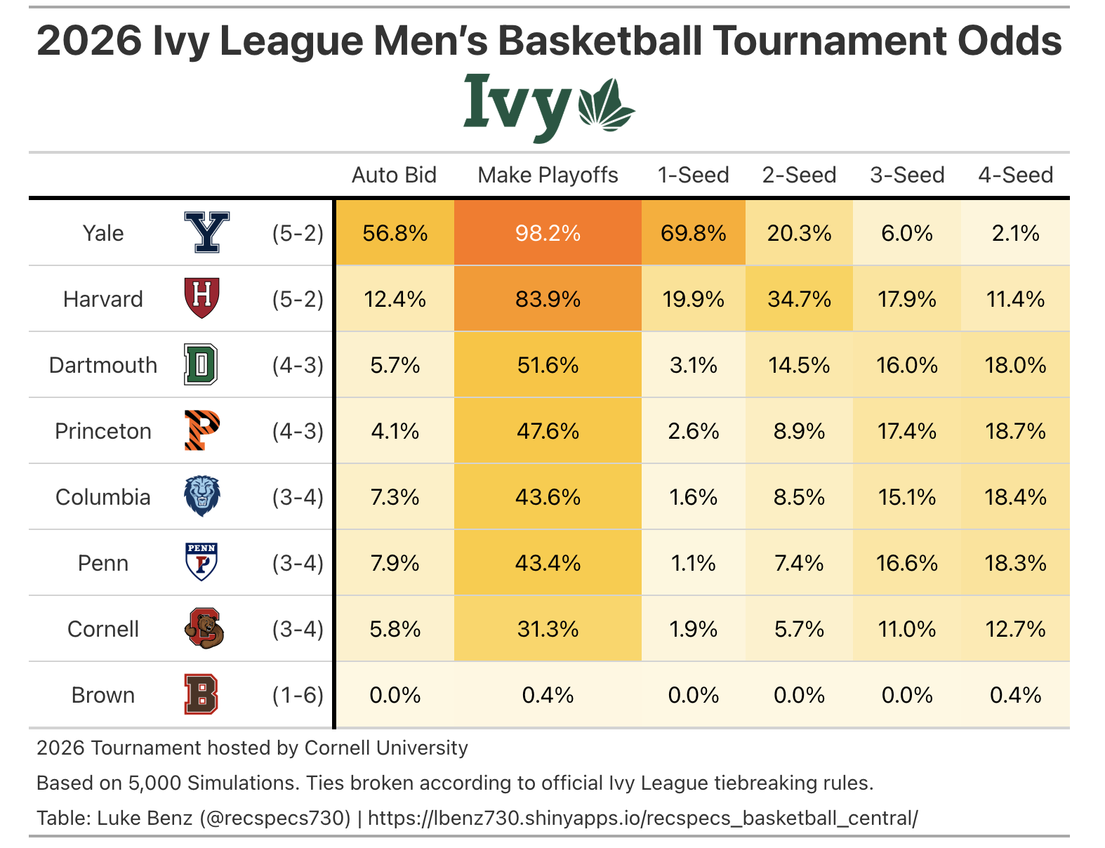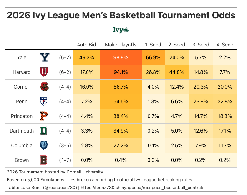 Here’s how the simulations shake out halfway through the season. Yale/Harvard in pretty good shape and then everyone else except brown in roughly same tier. Yale still has presumed edge for 1-seed despite currently losing tiebreaker to Harvard, but a lot closer than it would have been if I had run this before yesteday.