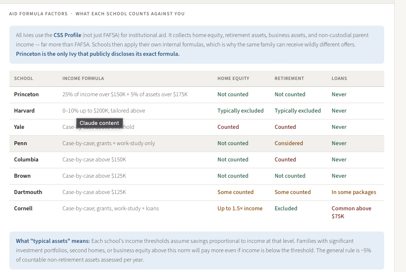 What’s genuinely underappreciated — beneath the headline income thresholds that get all the attention — are the nuances buried in each school’s formula. The same family can submit identical financial information and receive dramatically different aid offers from different schools, all of which technically “meet 100% of demonstrated need.” That’s because “demonstrated need” is not a fixed number. It’s an output of each school’s own methodology, and the inputs they choose to weight — or ignore — vary significantly.