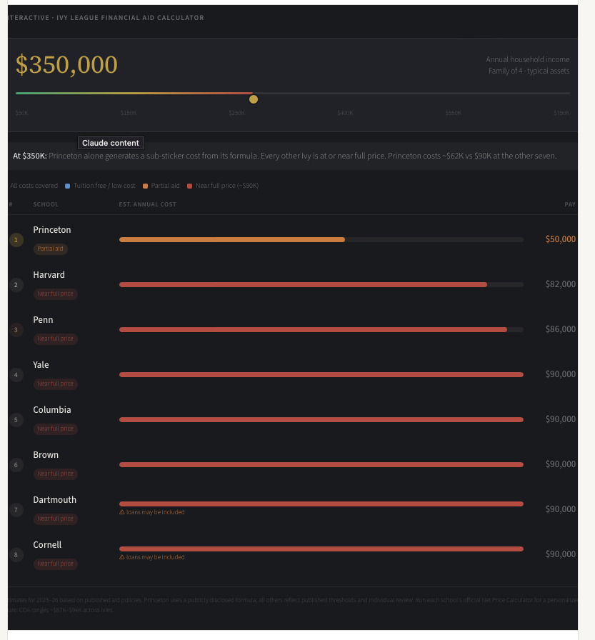 What I built with Claude’s help is a tool that estimates how much financial aid each Ivy will actually provide, based on each school’s published aid formula and net price calculator. Drag the slider to any income level and the ranking reshuffles in real time.