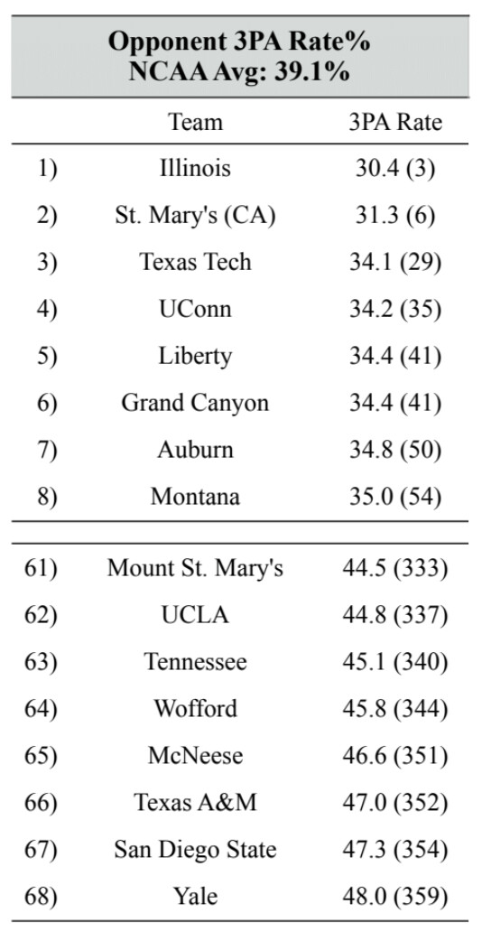 to your point, I think itâs still likely that TAMU dominates on the offensive glass as a product of Taylor IV isoâs and basic PNRâs (maybe at worst a +10 differential in favor of TAMU). However, Yale forces opponents to take a lot of threes due to Yaleâs defensive intensity. Coming in at 68th at a 48% 3PA rate% would be a pain against good three teams, for instance Cornell.
