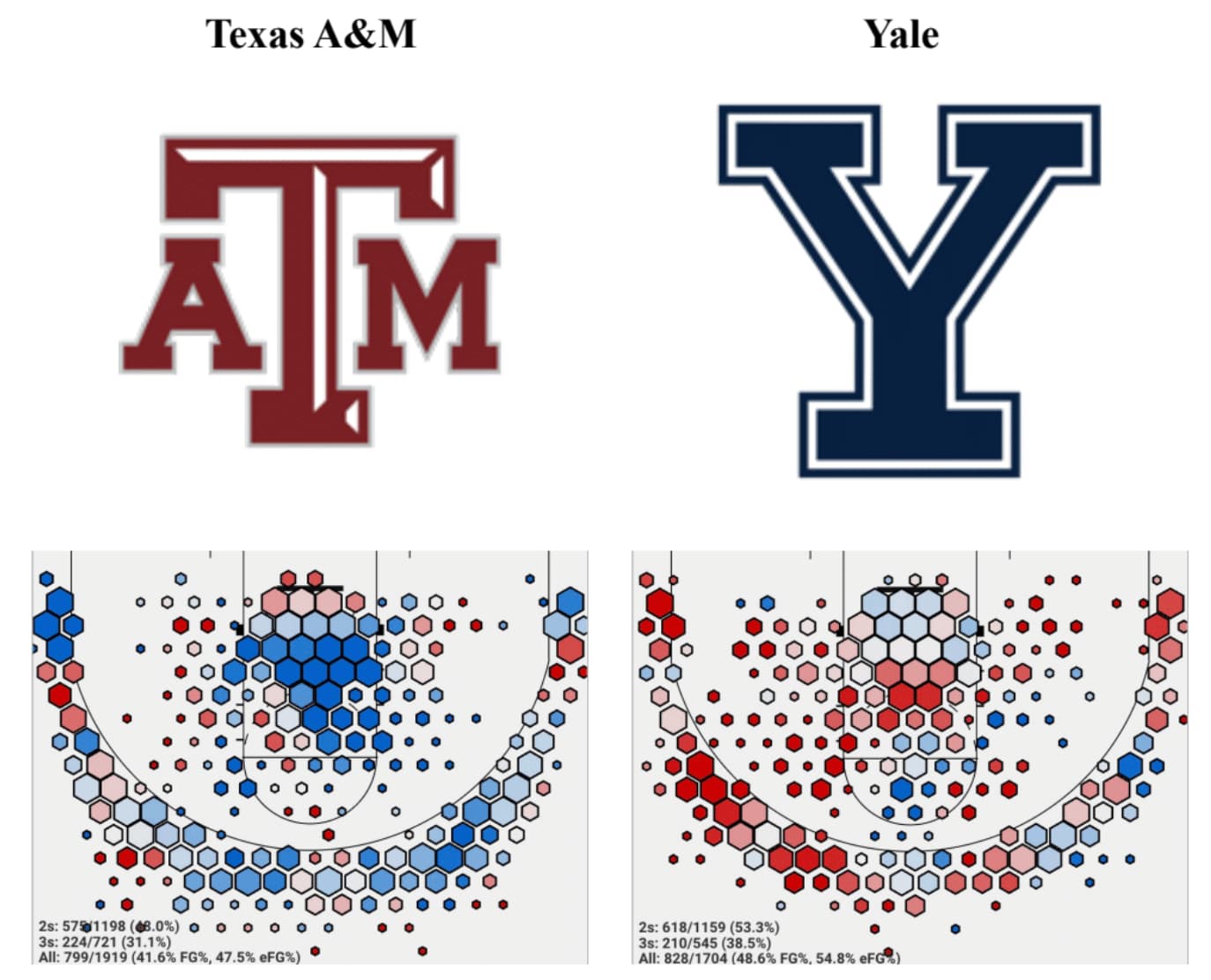 Yale is actually taller than A&M on average. There is zero doubt in my mind that Bez will put the clamps on Taylor and that Taylor will chuck up a ton of shots regardless. If the bigs can at least limit the damage on the offensive glass I think Yale will find a way to win. Stylistically, A&M also lets opponents put up a ton of threes and allows assisted baskets at the second-highest rate in the country. Off-ball screening to set up Poulakidas on the catch will be critical.