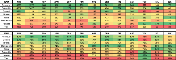 Columbia is intriguing—they return a high volume of production (second only to Princeton in many raw stats), but that still only represents ~65–70% of their total from last year. Depth might be a concern.