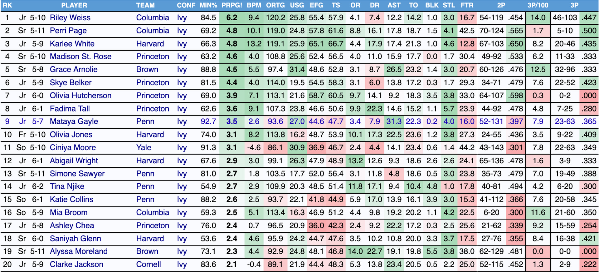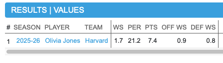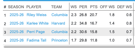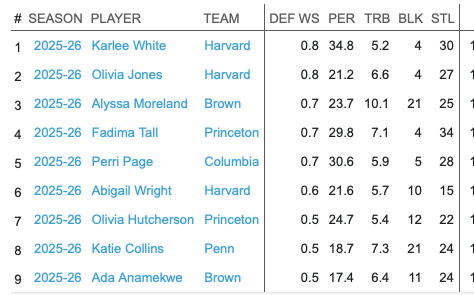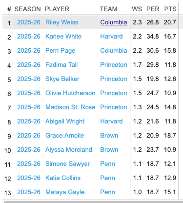 Mary Meng (Yale) would deserve serious consideration — she ranks third in rebounds (122) and leads the league outright in blocks (31) but Yale’s modest win total likely suppresses her win share figure, somewhat underselling her individual impact.