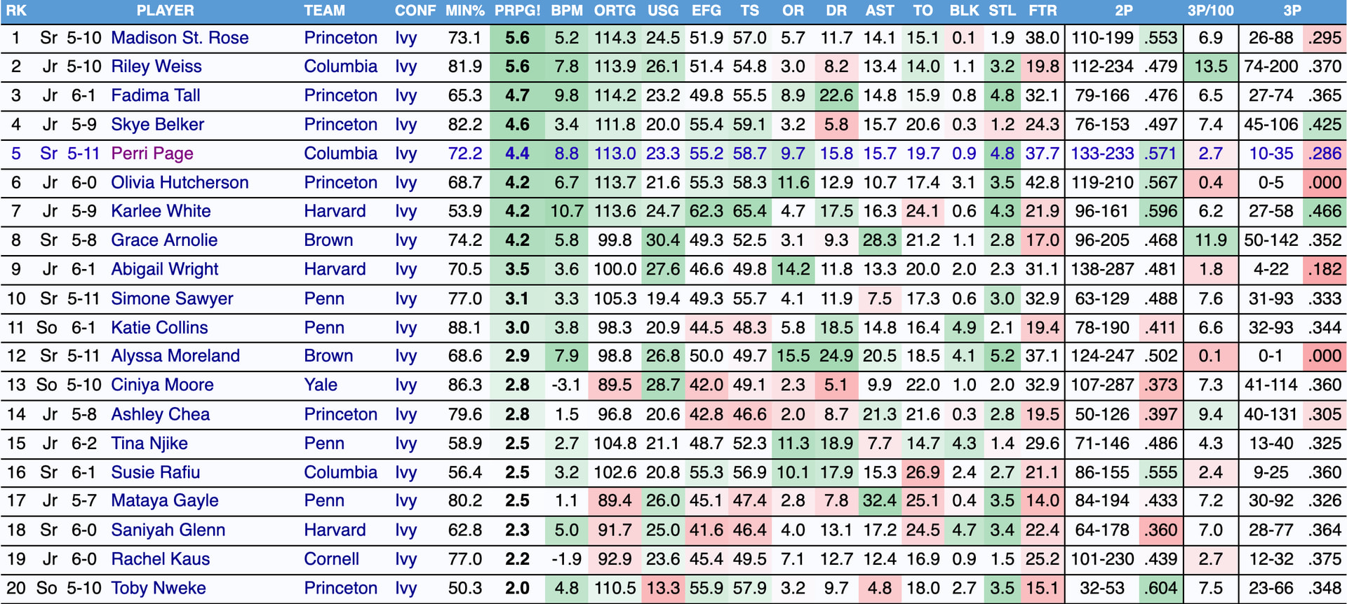 Hutcherson is not top 5 in any defensive category. In terms of raw stats, she is #12 in rebounding (#27 in defensive rebounding), #9 in blocks, and #10 in steals. In terms of composite stats, she is #16 in D-PRPG, #19 in DRTG, and #16 in DPBM. And Princeton is the 4th team in the league in ADJ Defensive Rating. I don’t doubt she is a good defender. But her season is not to be considered as DPOY.
