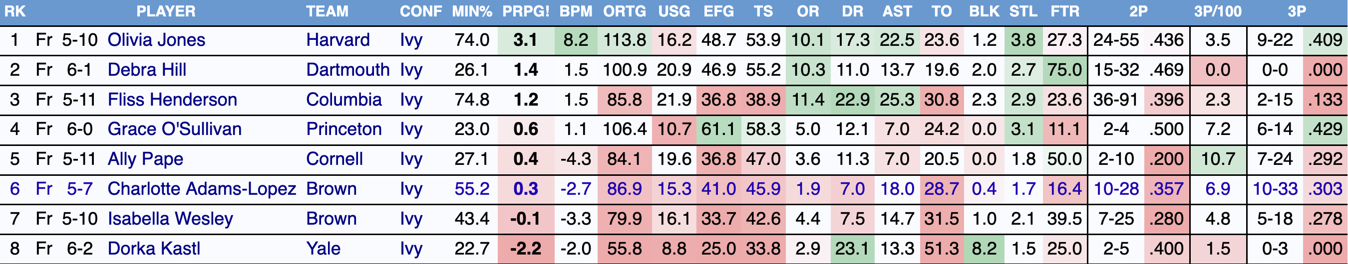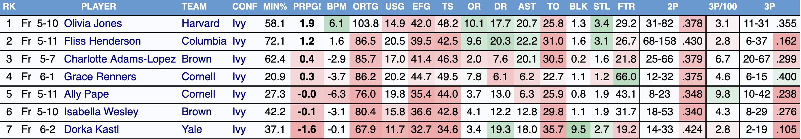 Olivia Jones (Harvard) stands alone as the clear choice here. No other first-year player in the league comes close to matching her overall impact — leading the conference in defensive win shares (0.8) while ranking sixth in rebounds and steals — making this award effectively uncontested.